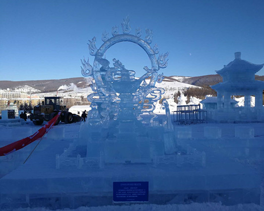 冰雕师傅和工人将一块块冰砖堆起来。一块冰大约1米长、20厘米宽、10厘米厚,冰雕师傅按照需求在这样的冰砖上打磨、刻凿。最后再将一些冰组合到一起。